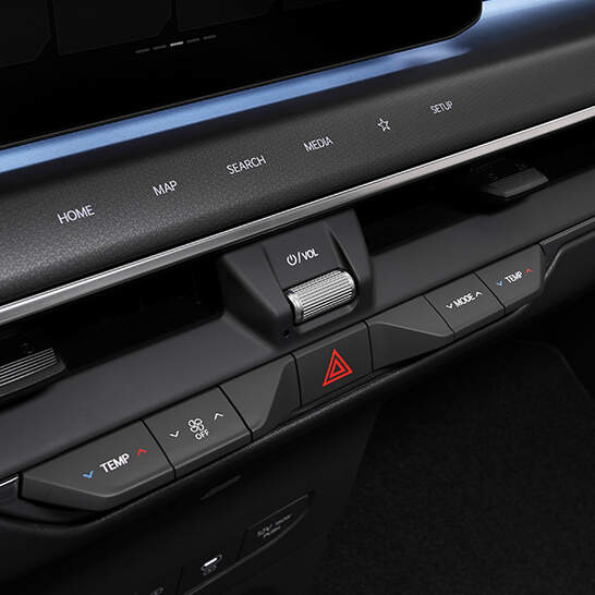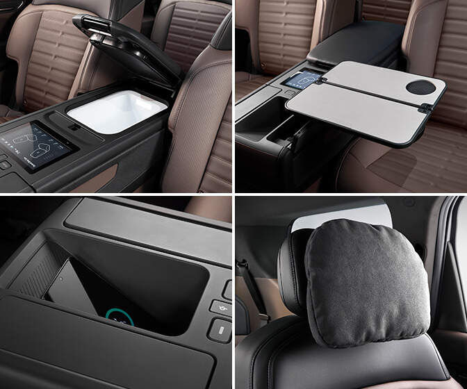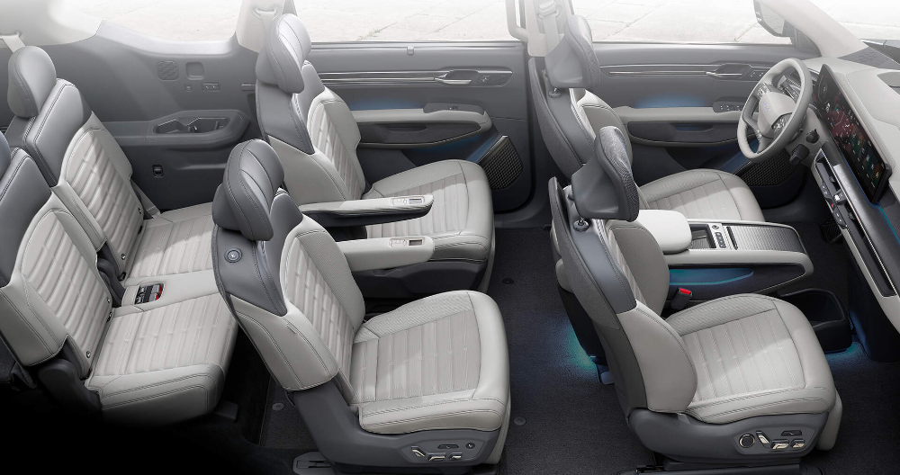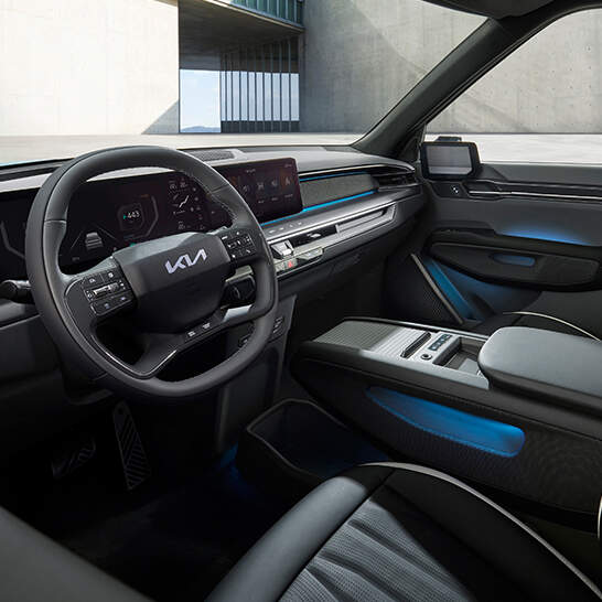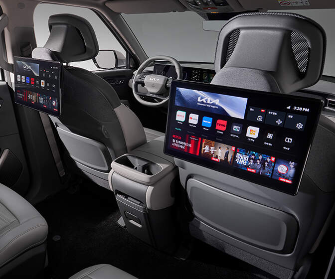 EV9의 실내는 넓은 공간과 첨단 기술이 결합된 고급스러운 분위기를 자아냅니다. 3열 7인승 구조로 설계된 실내는 대형 SUV답게 모든 탑승자가 편안함을 느낄 수 있도록 충분한 레그룸과 헤드룸을 제공합니다. 특히 2열 좌석은 회전식 시트로 되어 있어 탑승자 간 대화와 상호작용을 용이하게 해주는 기능이 특징입니다.
