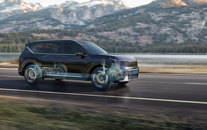 EV9에는 듀얼 모터 4륜구동(AWD) 시스템이 적용되어 다양한 노면 조건에서도 안정적인 주행을 제공합니다. 또한 전자식 서스펜션 시스템이 탑재되어 도로 상태에 맞춰 승차감을 자동으로 조절해주며, 스마트 회생제동 시스템이 주행 상황에 따라 에너지를 효율적으로 관리합니다.