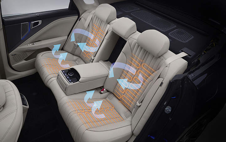 실내 공간은 기아 K8의 강점 중 하나로, 5명이 여유롭게 앉을 수 있는 넓은 공간을 제공합니다. 트림에 따라 나파 가죽 시트와 같은 프리미엄 소재로 마감된 시트는 탑승자의 편안함을 극대화합니다. 앞좌석뿐만 아니라 뒷좌석 시트 히팅 및 통풍 기능도 탑재되어 있어, 탑승자 모두가 최상의 안락함을 느낄 수 있습니다. 또한 앰비언트 라이트 시스템은 실내 분위기를 더욱 고급스럽게 연출해 줍니다.