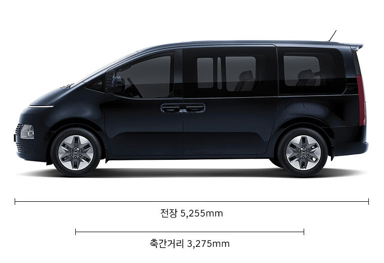 측면 디자인에서는 전장 5,255mm, 전폭 1,995mm, 전고 1,990mm로 길고 넓은 차체가 눈에 띕니다. 이 덕분에 승객과 화물 모두 넉넉한 공간을 제공하며, 전고가 높아 승차와 하차도 매우 편리합니다. 17인치 알로이 휠이 기본으로 장착되어 미니밴의 세련된 스타일을 더욱 부각시키며, 차량의 전체적인 균형감을 유지합니다.