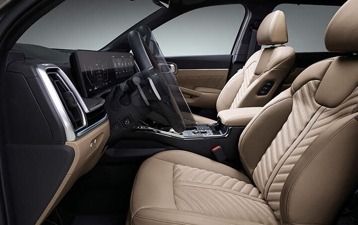 2024 쏘렌토 하이브리드의 실내는 운전자와 탑승객 모두에게 편안함을 제공하는 넓고 고급스러운 공간입니다. 7인승 구성으로 가족 모두가 편하게 이동할 수 있으며, 프리미엄 가죽 시트와 고급스러운 마감재가 실내 전체에 사용되어 안락한 분위기를 연출합니다. 2열 시트는 슬라이딩 및 리클라이닝 기능을 제공해 승객들이 더욱 편안한 자세를 취할 수 있도록 돕습니다.