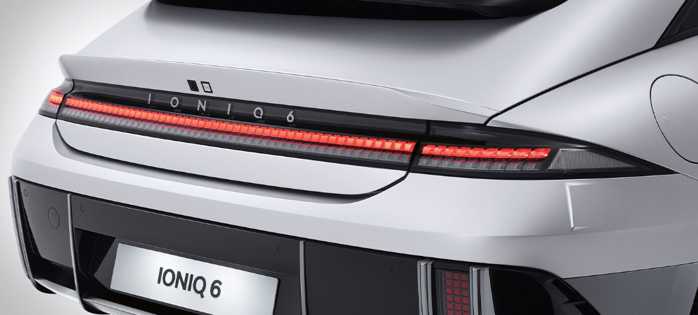 후면부 디자인은 리어 스포일러와 파라메트릭 픽셀 테일램프가 특징으로, 차량의 스포티한 이미지를 강조하면서도 미래지향적인 느낌을 더합니다. 전반적으로 아이오닉 6의 외관 디자인은 공기역학적인 효율성과 고급스러운 스타일이 조화를 이룬 모습입니다.