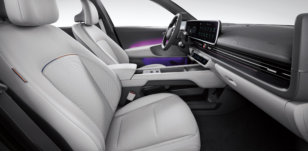 실내는 친환경 소재로 마감되어 있으며, 프리미엄 가죽 시트와 앰비언트 무드 라이팅이 적용되어 고급스러움을 더합니다. 또한, 전동 시트 조절 기능과 통풍 및 히팅 시트가 제공되어 주행 환경에 맞는 최적의 편안함을 유지할 수 있습니다. 실내 공간은 넉넉하게 설계되었으며, 전고 1,495mm 덕분에 뒷좌석에서도 충분한 헤드룸을 제공합니다.