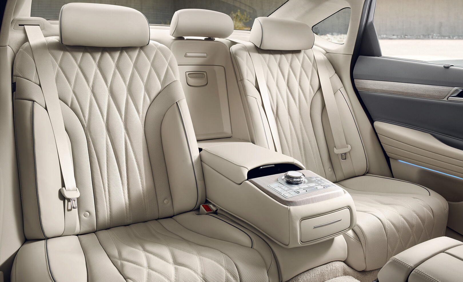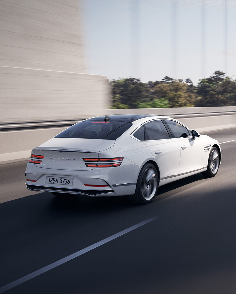 후면부는 쿼드 리어 램프와 크롬 장식이 깔끔하게 배치되어 전체적인 균형감을 유지하며, 하단에는 듀얼 배기구가 적용되어 차량의 성능을 시각적으로도 강조합니다. G80의 디자인은 고급 세단의 품격을 유지하면서도 역동적이고 현대적인 감각을 가미하여 글로벌 시장에서도 호평을 받고 있습니다.