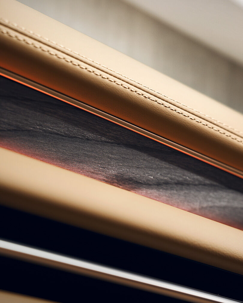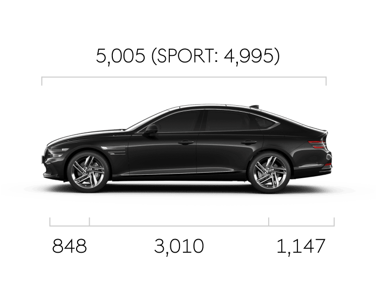 측면은 긴 휠베이스와 날렵한 루프라인이 강조되어, 전체적으로 균형 잡힌 실루엣을 보여줍니다. 전장 4,995mm, 전폭 1,925mm, 전고 1,465mm의 크기는 동급 차량 중에서도 넉넉한 차체 크기를 자랑하며, 길고 낮은 디자인이 안정감을 줍니다. 또한 19인치 또는 20인치 알로이 휠을 선택할 수 있어 차의 스포티한 매력을 더할 수 있습니다.