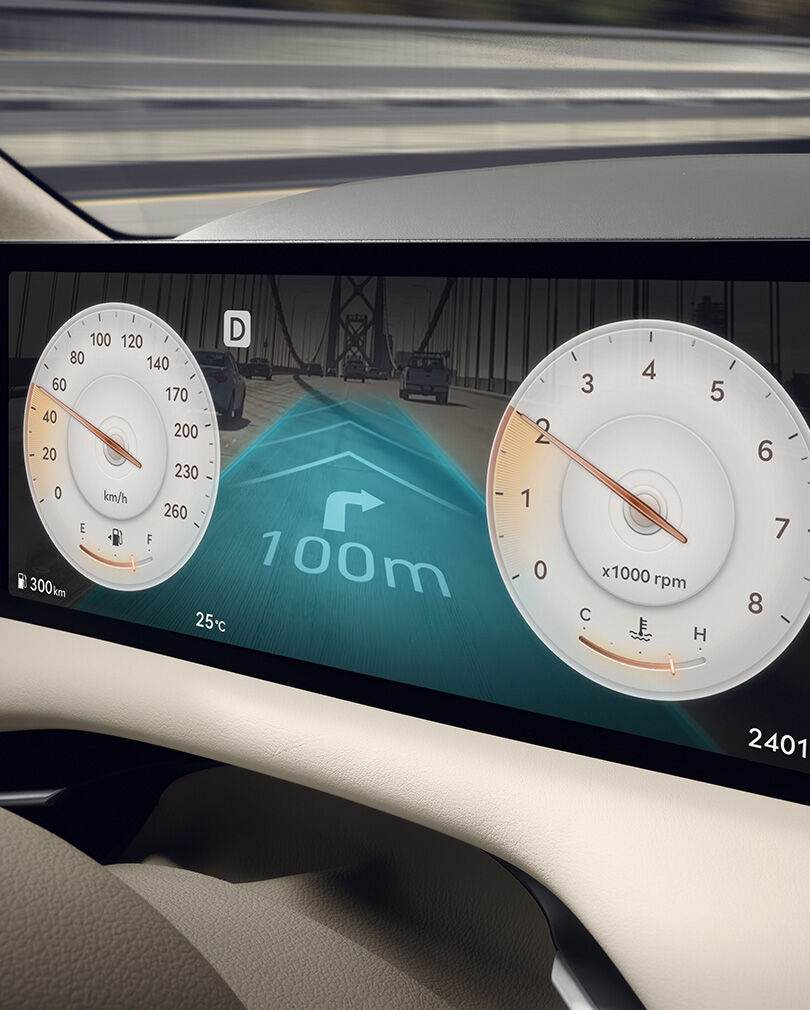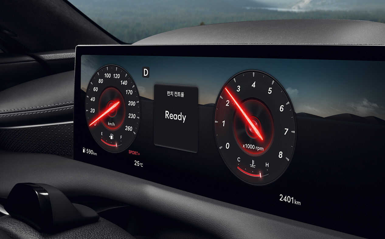대시보드는 14.5인치 대형 터치스크린 디스플레이가 중앙에 자리 잡고 있으며, 최신 제네시스 인포테인먼트 시스템이 적용되었습니다. 이 시스템은 애플 카플레이와 안드로이드 오토를 지원하며, 음성 명령으로 내비게이션, 음악 재생, 차량 설정 등을 손쉽게 조작할 수 있습니다. 12.3인치 3D 디지털 계기판은 주행 정보와 차량 상태를 직관적으로 보여주며, 증강 현실 헤드업 디스플레이는 운전 중 도로 상황과 주요 정보를 시야에 투영합니다.