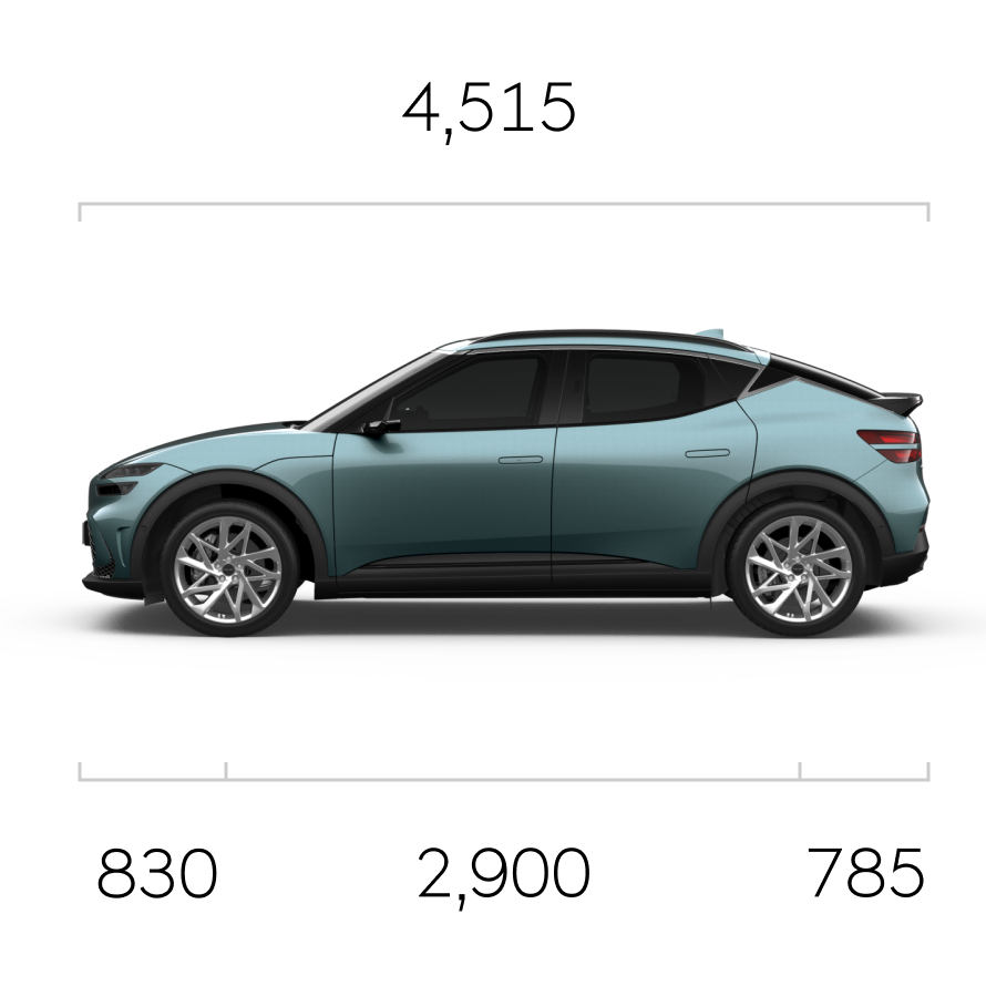 측면은 전기차다운 매끄러운 곡선이 돋보입니다. 전장 4,515mm, 전폭 1,890mm, 전고 1,580mm로 대형 SUV보다는 콤팩트한 크기이지만, 충분한 존재감을 느낄 수 있습니다. 또한, 21인치 알로이 휠은 GV60의 스포티한 매력을 더해주며, 공기역학적 디자인으로 효율성까지 고려했습니다. 후면부에서는 슬림한 LED 테일램프가 날렵하게 자리 잡아 차량의 뒷모습을 깔끔하게 마무리합니다. GV60의 전반적인 디자인은 럭셔리와 현대적인 전기차 이미지를 잘 결합한 것으로 평가받고 있습니다.