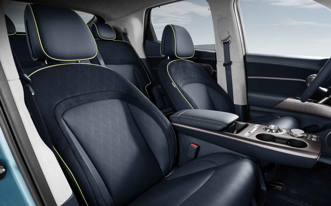 GV60의 실내는 고급스러운 마감과 최첨단 기술이 결합되어 있습니다. 실내에서는 제네시스만의 프리미엄 가죽 시트우드 트림이 적용되어 편안함과 고급스러움을 동시에 제공합니다. 5인승 구조로 설계된 실내 공간은 넉넉하며, 탑승자는 장거리 여행에서도 편안한 좌석을 경험할 수 있습니다.