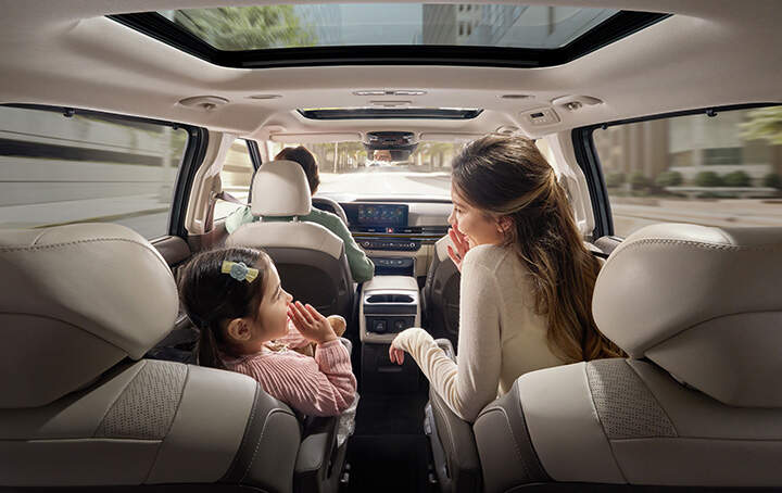 실내 공간은 카니발만의 넉넉한 적재 공간을 제공합니다. 트렁크 기본 용량은 627리터이며, 3열 시트를 접으면 2,785리터까지 확장 가능합니다. 이는 대가족이 장거리 여행을 갈 때에도 충분한 수납 공간을 확보할 수 있다는 점에서 큰 장점입니다. 또한, 파노라마 선루프가 적용되어 차량 내부의 개방감을 극대화하여, 탑승객들이 보다 쾌적한 주행 경험을 할 수 있습니다.