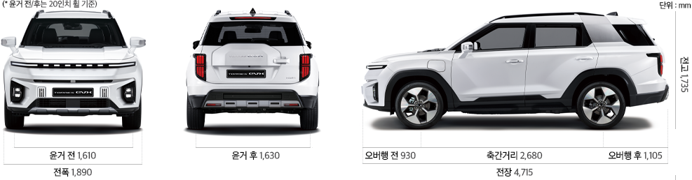 차체는 전장 4,710mm, 전폭 1,890mm, 전고 1,730mm로 중형 SUV의 장점을 고스란히 담고 있습니다. 측면 디자인은 날렵한 캐릭터 라인과 함께 20인치 휠을 통해 스포티한 감각을 강조하고, SUV 특유의 강인한 느낌을 더욱 부각시킵니다.