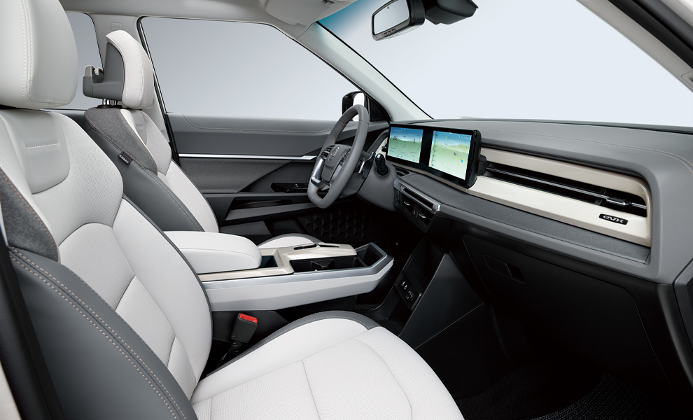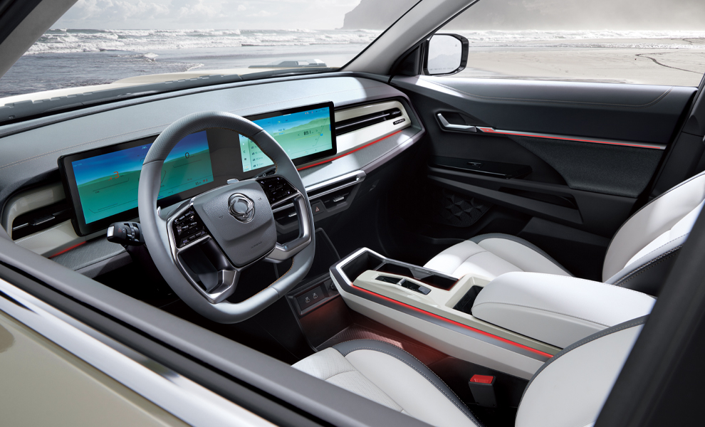2024 토레스 EVX의 실내는 미니멀한 디자인과 첨단 기술이 결합된 공간으로, 고급스러운 느낌과 함께 실용성을 강조했습니다. 12.3인치 디지털 계기판과 12.3인치 인포테인먼트 디스플레이는 운전자가 필요한 모든 정보를 한눈에 확인할 수 있도록 배치되었으며, 터치스크린을 통해 차량의 모든 기능을 직관적으로 조작할 수 있습니다.
