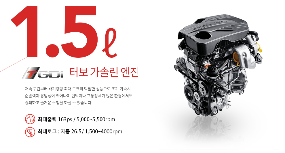 차량의 제원은 전장 4,225mm, 전폭 1,810mm, 전고 1,620mm로 콤팩트하면서도 넉넉한 실내 공간을 제공합니다. 최대 출력은 163마력, 복합 연비는 12.1km/ℓ로 도심과 고속도로에서 모두 우수한 성능을 발휘합니다. 트렁크 용량은 기본 427리터로, 필요 시 2열 좌석을 폴딩하여 추가적인 적재 공간을 활용할 수 있습니다.