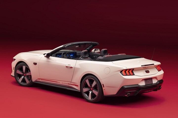 후면부에서는 시그니처 LED 테일램프와 함께 머스탱만의 독창적인 디자인 요소인 삼분할 테일램프가 자리 잡고 있습니다. 듀얼 머플러가 장착된 범퍼 디자인은 머스탱의 역동성을 강조하며, 리어 스포일러는 차량의 스포티한 성능을 상징합니다.