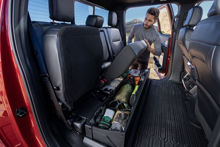 시트는 프리미엄 가죽 시트로 마감되었으며, 앞좌석과 뒷좌석 모두 넉넉한 공간을 자랑합니다. 전동 시트 조절 기능과 열선 및 통풍 기능이 탑재되어 다양한 기후 조건에서도 쾌적한 주행이 가능합니다. 또한, F-150은 여러 도구를 보관할 수 있는 숨겨진 수납공간이 있어 작업 중에도 실내를 깔끔하게 유지할 수 있습니다.