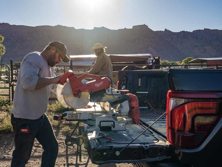 차량의 전장 5,885mm, 전폭 2,432mm, 전고 1,961mm는 픽업트럭 중에서도 대형 모델에 속하며, 실용적인 측면에서도 넉넉한 공간을 제공합니다. 측면에는 20인치 알로이 휠이 장착되어 고급스러우면서도 튼튼한 인상을 주며, 후면부는 LED 테일램프와 대형 트레일러 히치가 장착되어 다양한 용도로 활용 가능합니다.