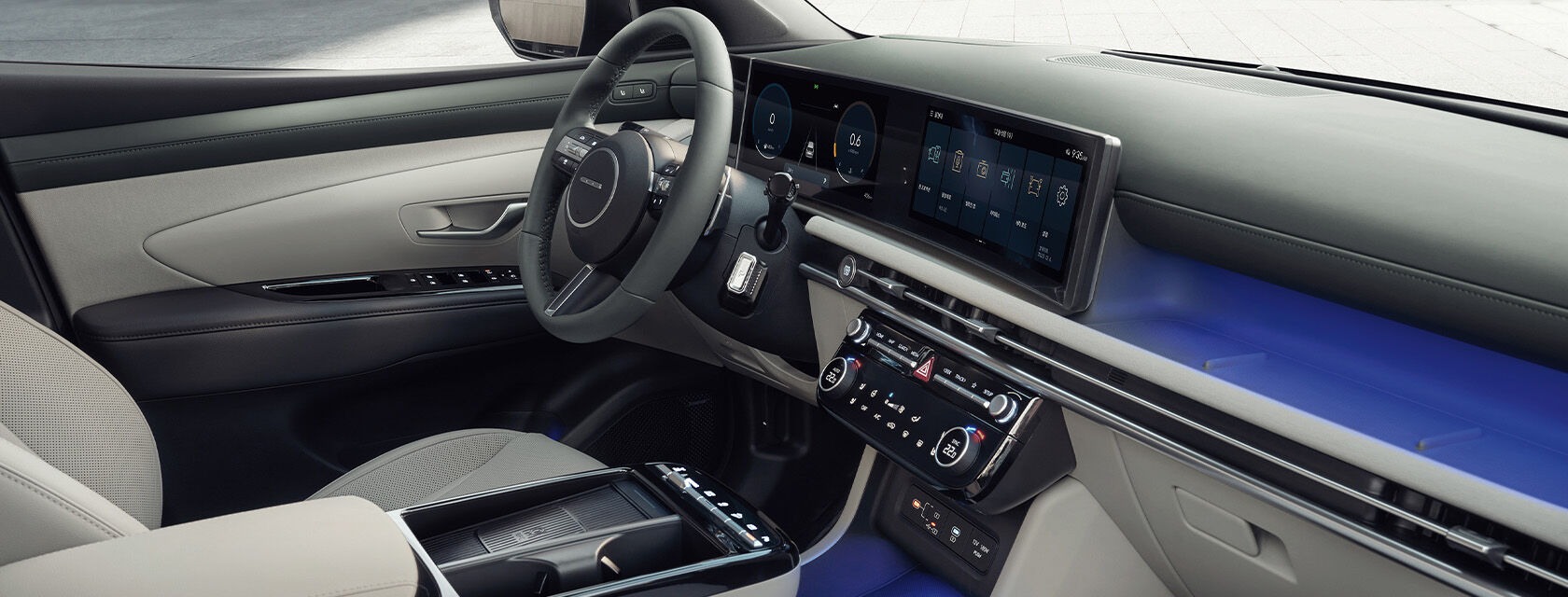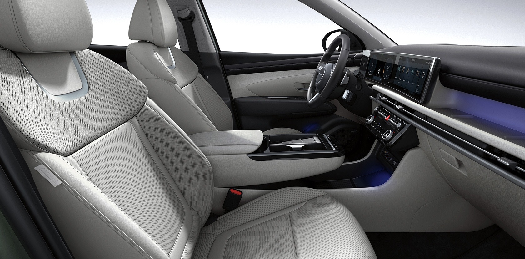 투싼의 실내는 미니멀리즘과 첨단 기술이 조화를 이루는 공간입니다. 운전석에 앉으면 가장 먼저 눈에 띄는 것은 10.25인치 디지털 클러스터와 10.25인치 터치스크린 디스플레이입니다. 이 디스플레이는 내비게이션, 엔터테인먼트, 차량 설정 등 다양한 기능을 손쉽게 조작할 수 있도록 설계되었습니다.
