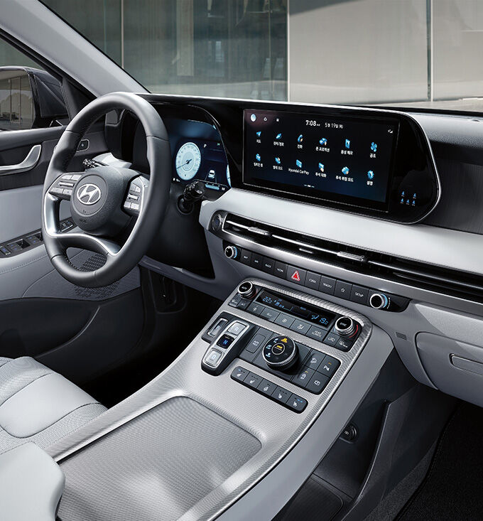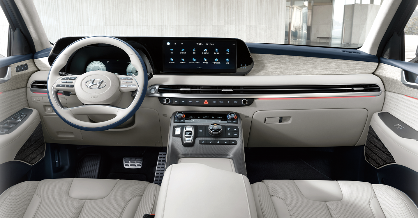 2024 현대 펠리세이드의 실내는 넓고 안락한 공간이 돋보입니다. 7인승 또는 8인승 구조로 구성되어 있으며, 3열 좌석도 성인이 편안하게 앉을 수 있을 만큼 넓은 공간을 제공합니다. 나파 가죽 시트와 우드 트림이 적용된 고급스러운 인테리어는 장시간의 주행에도 탑승자의 피로를 줄여줍니다.