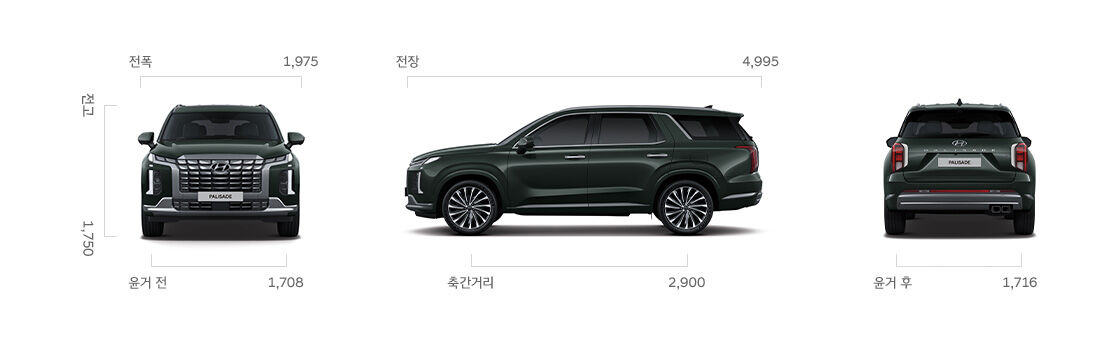 측면 디자인에서는 펠리세이드의 크기가 더욱 돋보입니다. 전장 4,980mm, 전폭 1,975mm, 전고 1,750mm의 크기는 넉넉한 실내 공간을 예상하게 합니다. 차체 라인은 유려한 곡선과 날렵한 직선을 조화롭게 이어가며, 대형 SUV임에도 불구하고 역동적인 느낌을 자아냅니다. 후면부 역시 세로형 LED 리어램프와 듀얼 머플러 팁으로 완성된 세련된 마무리를 보여줍니다. 20인치 알로이 휠이 기본으로 제공되며, 다양한 색상 옵션을 통해 개성 있는 스타일링이 가능합니다.