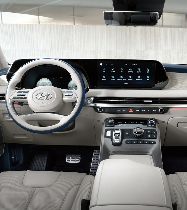 2024 현대 펠리세이드의 실내는 넓고 안락한 공간이 돋보입니다. 7인승 또는 8인승 구조로 구성되어 있으며, 3열 좌석도 성인이 편안하게 앉을 수 있을 만큼 넓은 공간을 제공합니다. 나파 가죽 시트와 우드 트림이 적용된 고급스러운 인테리어는 장시간의 주행에도 탑승자의 피로를 줄여줍니다.