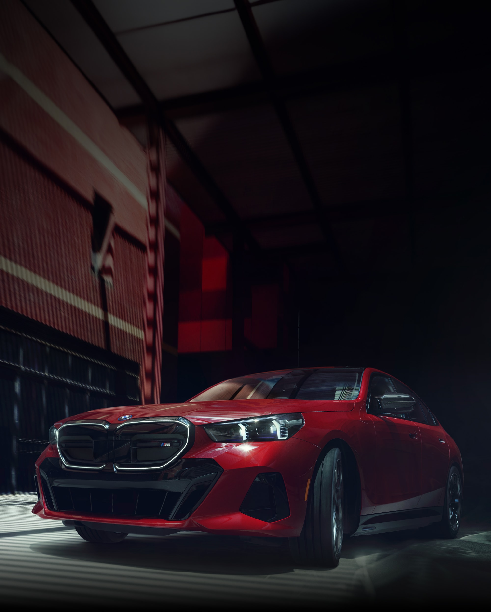 2024 BMW i5는 BMW의 전기차 라인업을 상징하는 미래지향적인 디자인을 채택했습니다. 전면부에서는 BMW의 상징적인 키드니 그릴이 그대로 유지되면서도, 전기차의 특성에 맞게 막혀 있는 형태로 공기역학적 효율성을 극대화했습니다. 그릴을 둘러싼 크롬 디테일과 슬림한 LED 헤드램프는 날렵하고 세련된 인상을 주며, 차의 고급스러움을 강조합니다.